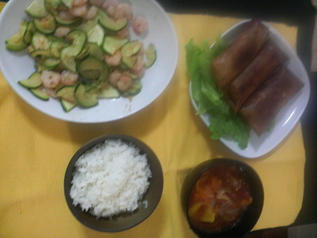 春巻き、海老とズッキーニの炒めもの、ミネストローネ。