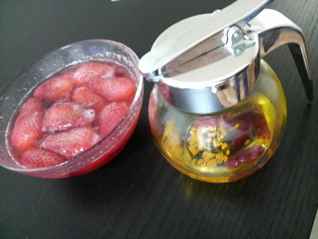 じゃーん。自家製イチゴジャムと唐辛子オイル。